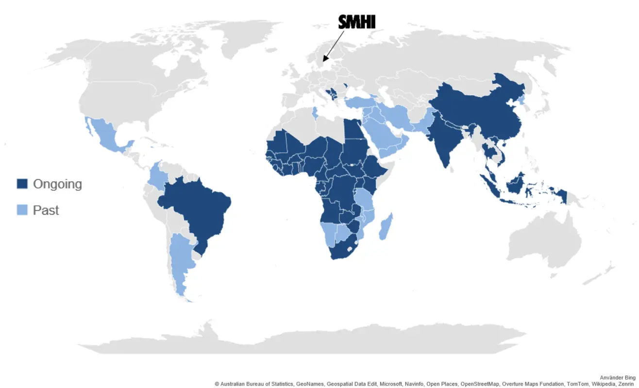 Map of SMHI's international development cooperation activities on national and regional scales. Additional activities on global scale include climate modelling and climate services.