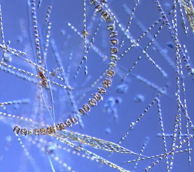 Skeletonema marinoi, Rhizosolenia setigera och Thalassiosira nordenskioeldii är alla kiselalger som är typiska under vårblomningen. Mikroskopbilden är från ett levandeprov taget i februari 2011 vid Nidingen i Hallands kustvatten.