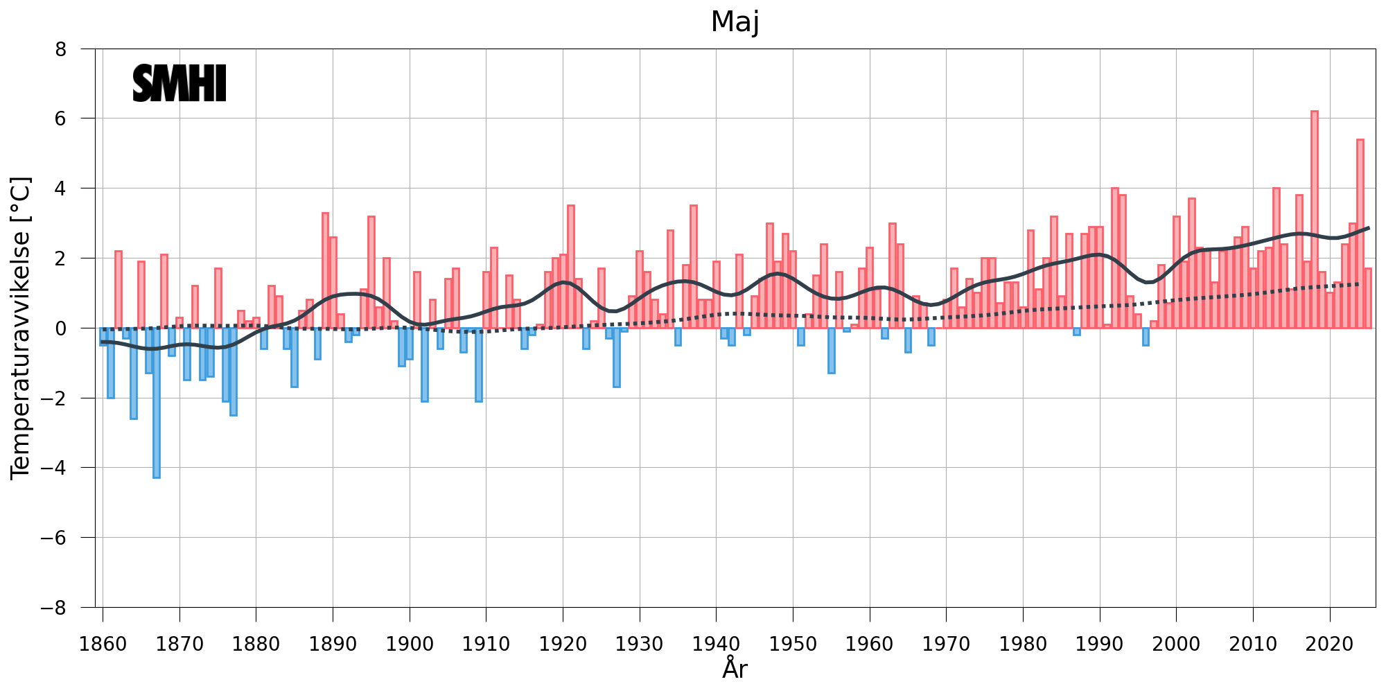 Förstora bildenStapeldiagrammet visar avvikelsen från ett referensvärde 1860-1900 för Sverigemedeltemperaturen i maj (baserat på 35 stationer med mycket långa mätserier). Den svarta kurvan visar ett utjämnat förlopp ungefär motsvarande tio-åriga medelvärden. Linjen med prickar visar motsvarande utjämnade förlopp för den globala medeltemperaturen i maj (data från CRU).