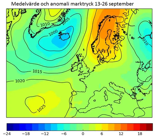 Förstora bildenFigur 1. Beräknat medelvärde av lufttrycket reducerat till havsytans nivå för perioden 13-26 september. Överlagrat är avvikelsen från ett klimatologiskt värde beräknat utifrån återanalyser från ECMWF (ERA interim).