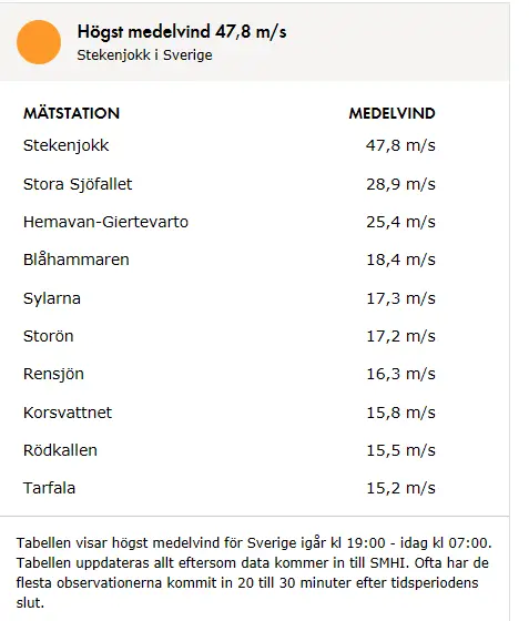När det gäller så här höga medelvindhastigheter är det egentligen bara stationen Stekenjokk som kan komma ifråga, men förmodligen kan det blåsa lika mycket på andra håll i fjällkedjan där vi inte har stationer.