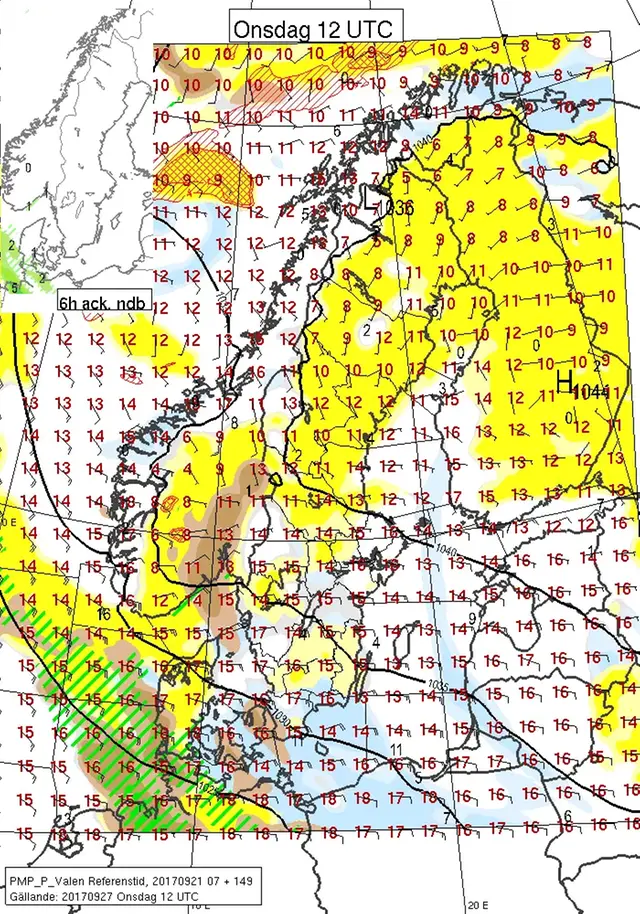 Förstora bildenPrognoskarta för den 27 september 2017 utfärdad den 21 september. Praktiskt taget hela Norrland väntas då få lufttryck på minst 1040 hPa.