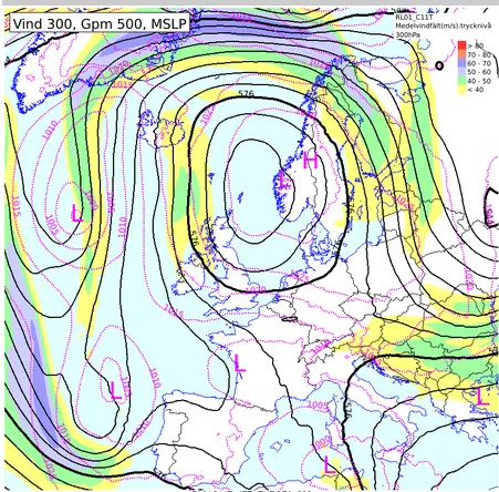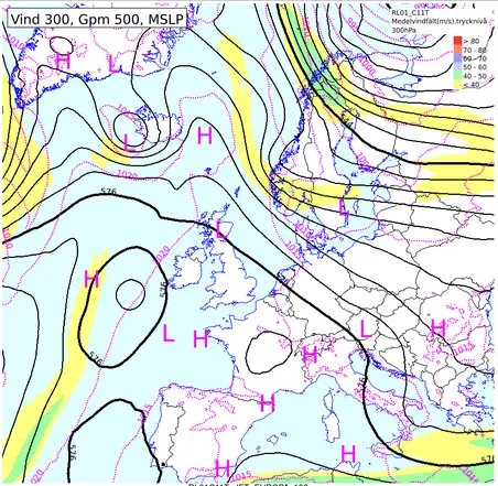 Den förhållandevis svaga jetströmmen svänger från området kring Azorerna rakt norrut mot Island och sedan via i en båge över nordligaste Skandinavien rakt söderut mot Balkan.