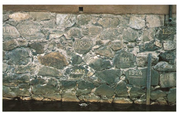 Högvattenmärken i Faluån, centrala Falun. Notera att pegeln, ”linjalen”, till höger i bilden svämmats över vid ett antal tillfällen.
