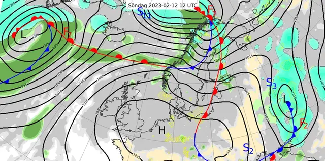 Förstora bildenAnalys av väderläget klockan 13 svensk tid söndagen den 12 februari 2023.