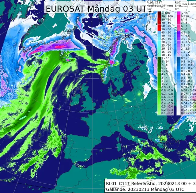 Förstora bildenPrognoserad nederbörd gällande klockan 03 UTC den 13 februari 2023. Källa: ECMWF