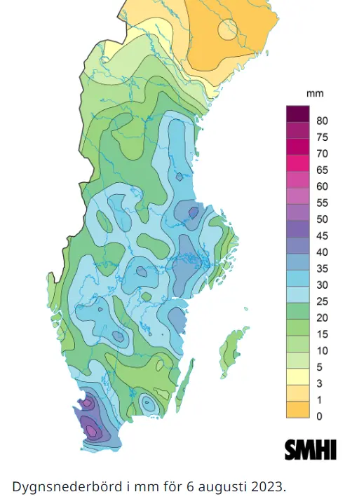 Förstora bildenKartan visar dygnsnederbördsmängden i millimeter för den 6 augusti 2023.
