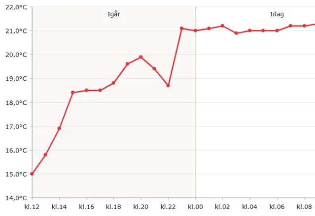 Förstora bildenTemperaturförlopp i Krångede i Jämtland natten till den 8 augusti 2023.
