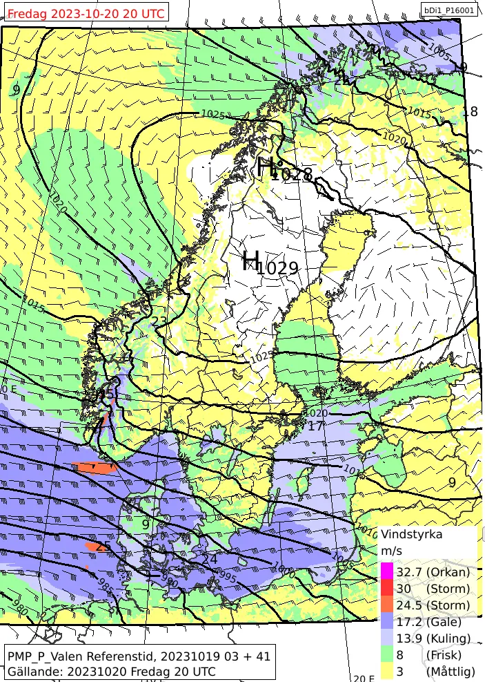 Vindfält och lufttryck. Prognos för klockan 22 den 20 oktober 2023.
