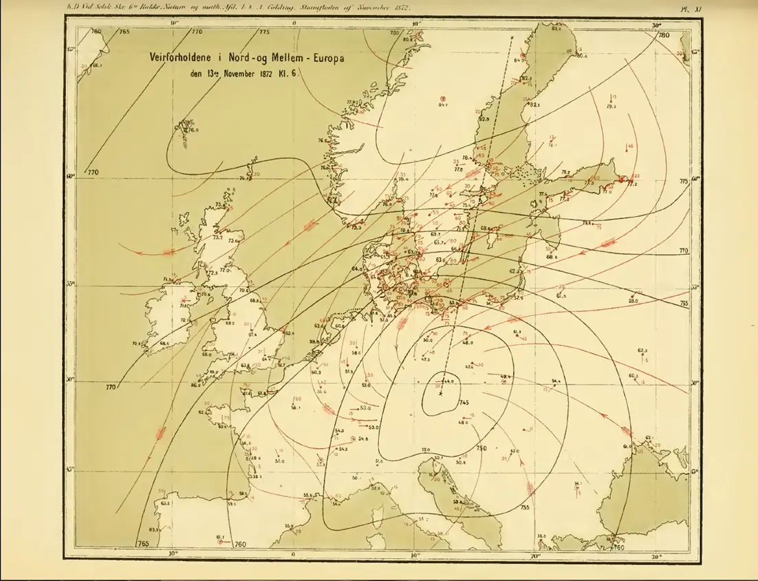 Förstora bildenAugust Colding rekonstruerade 1881 väderkartor för stormflodsdygnet. Här är kartan för den 13 november 1872 kl 06. Svarta linjer är isobarer i mm Hg, röda linjer anger vindriktningen.