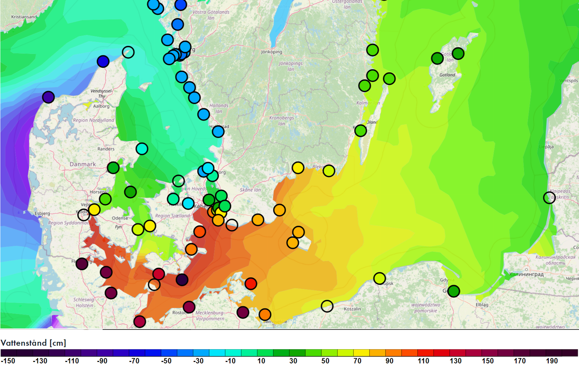 Förstora bildenVattenstånd. Prognos för klockan 02 den 21 oktober 2023. Lägg märke till hur de grunda och smala passagerna i Öresund och Bälten effektivt blockerar vattnet i Östersjön från att strömma vidare.