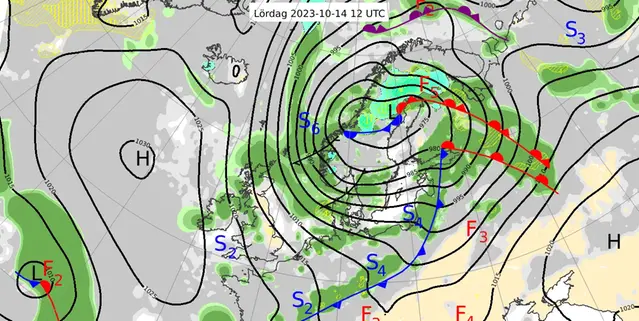 Förstora bildenVäderanalys gällande klockan 14 den 14 oktober 2023.
