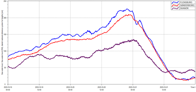 Med den ostliga vinden svepte vattnet förbi den svenska sydkusten innan det kraschade in i den tyska och danska Östersjökusten. Där blev nivåerna betydligt högre än i Skåne, högst nådde vattnet i Flensburg med 227 cm. Andra stationer som nådde över två meter var Aabenraa med 216 cm, Eckernförde med 215 cm, Haderslev med 214 cm, Hesnæs och Sønderborg med 210 cm, samt Fynshav och Faaborg vilka båda noterade 203 cm. De flesta övriga danska och tyska stationer i sydvästra Östersjön uppmätte mellan 150 och 200 cm på kvällen den 20 oktober.