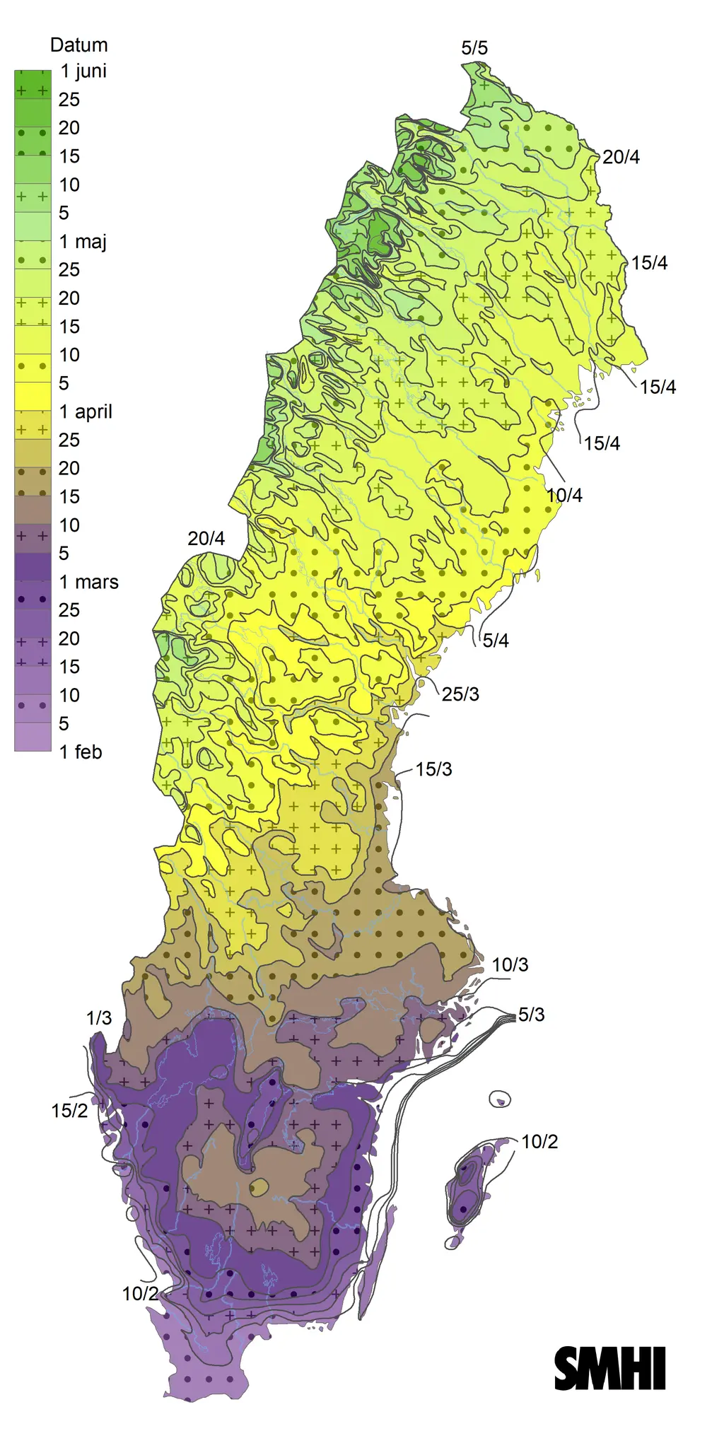 I årstidskartan kan man se skönja det lilla mörkgröna området kring Umeå som markerar vårens ankomst där. Mörkgrönt är nu även längs med delar av kusten i Gästrikland och Hälsingland.