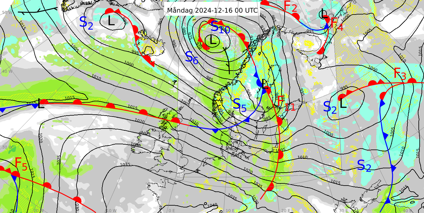 Förstora bildenAnalys av väderläget klockan 01 den 16 december 2024. Strax före klockan 03 kulminerade decembervärmen vid Harstena med som mest 12,1°. Kort efter klockan 03 kulminerade byvinden vid Visingsö i Vättern med som mest 30,9 m/s.