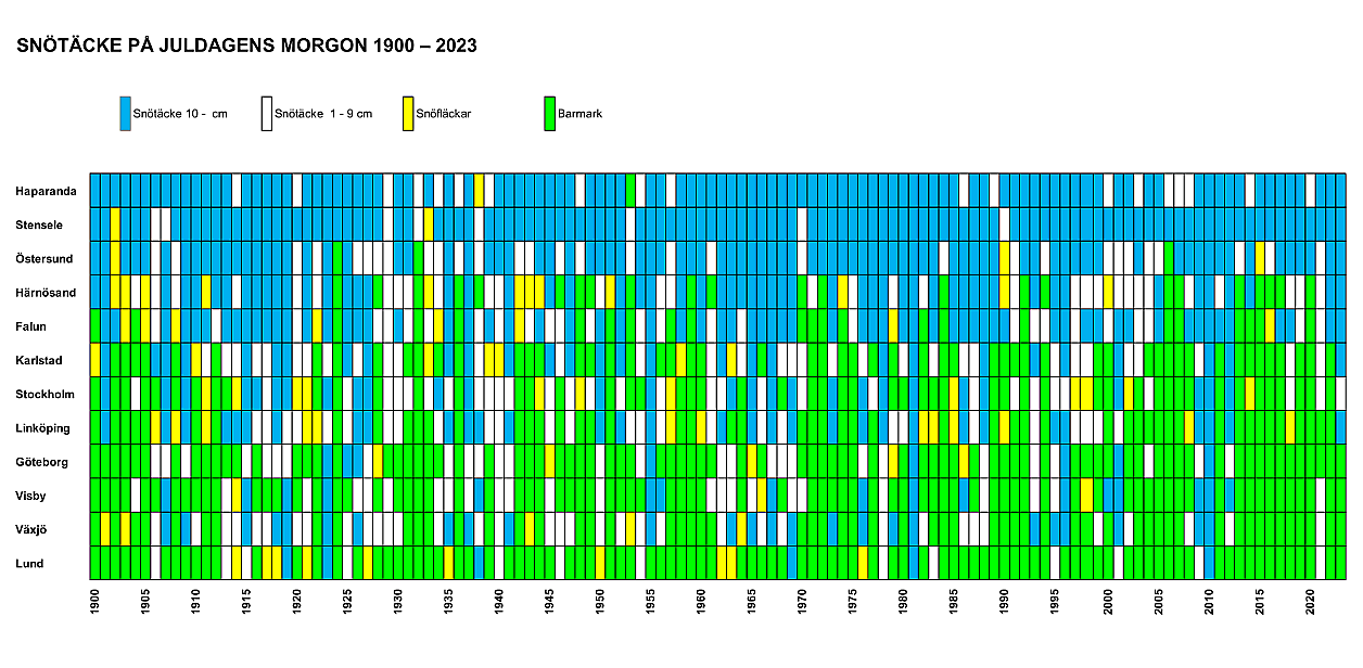 I norr ser det däremot enligt nuvarande prognos ut att bli vinterväder hela vägen fram till jul. Dessutom väntas påspädning av det på en del håll tunna snötäcket. Hudiksvall i Hälsingland hade på måndagsmorgonen 1 cm, Orsa i Dalarna 7 cm, Marby i Jämtland 8 cm, Särna i Dalarna 11 cm och Piteå i Norrbotten 12 cm. För 100 år sedan hade Östersund en grön jul vilket är ovanligt. Detta upprepades där igen 1932 och 2006.
