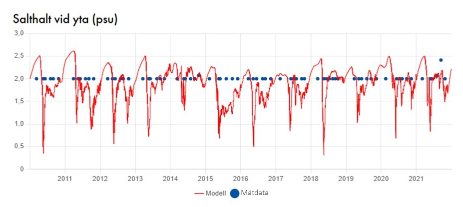 Dessa justeringar av vattenutbyte och vertikal blandning görs genom jämförelser mellan modell och mätdata. Jämförelser baseras på den mätdata som finns tillgänglig i Svenskt HavsARKiv (SHARK).