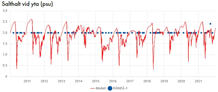 Förstora bildenExempel på modelldata (röd linje) och mätdata (blåa punkter) i en kustvattenförekomst där rapporteringsgränsen för aktuella mätinstrument varit 2 PSU.