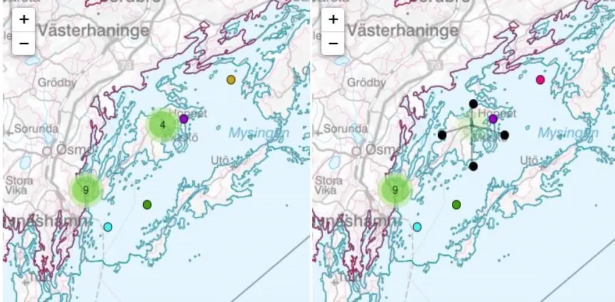 Om en station har flera mätningar på samma position så visas den bara en gång i kartan. Har mätningarna däremot utförts vid samma station men vid något skilda positioner så visas flera punkter med samma färg i kartan som ett klickbart kluster (se bilden nedan). Det kan också hända att olika mätstationer ligger mycket nära varandra i vattenförekomsten, eller att data från samma mätstation har rapporterats in under olika namn. Dessa visas också som kluster i kartan. Klustersymbolens position motsvarar stationernas position och genom att klicka på klustret kan man se vilka mätstationer som ingår.