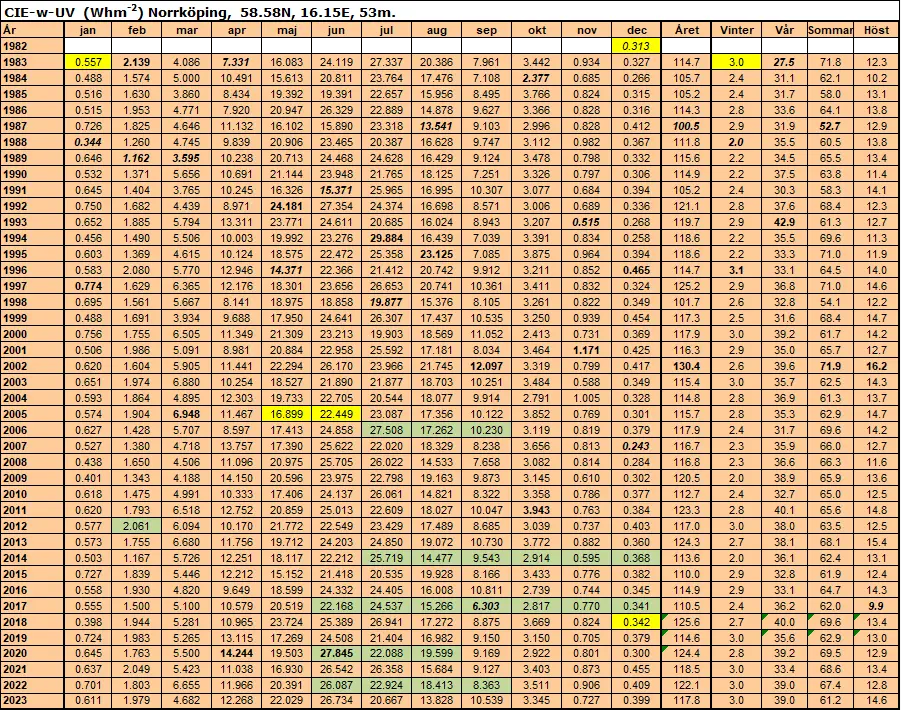 Förstora bildenTabell. CIE-viktad UV-strålning uppmätt i Norrköping 1983-2023. Enheten är Wh/m². Några månader har modellberäknats (helt eller delvis) från globalstrålning och totalozon. De är markerade med gult. De värden som är uppmätta med ett annat UV-instrument är markerade med grönbakgrund. Feta värden är extremerna för respektive månad, år eller säsong.