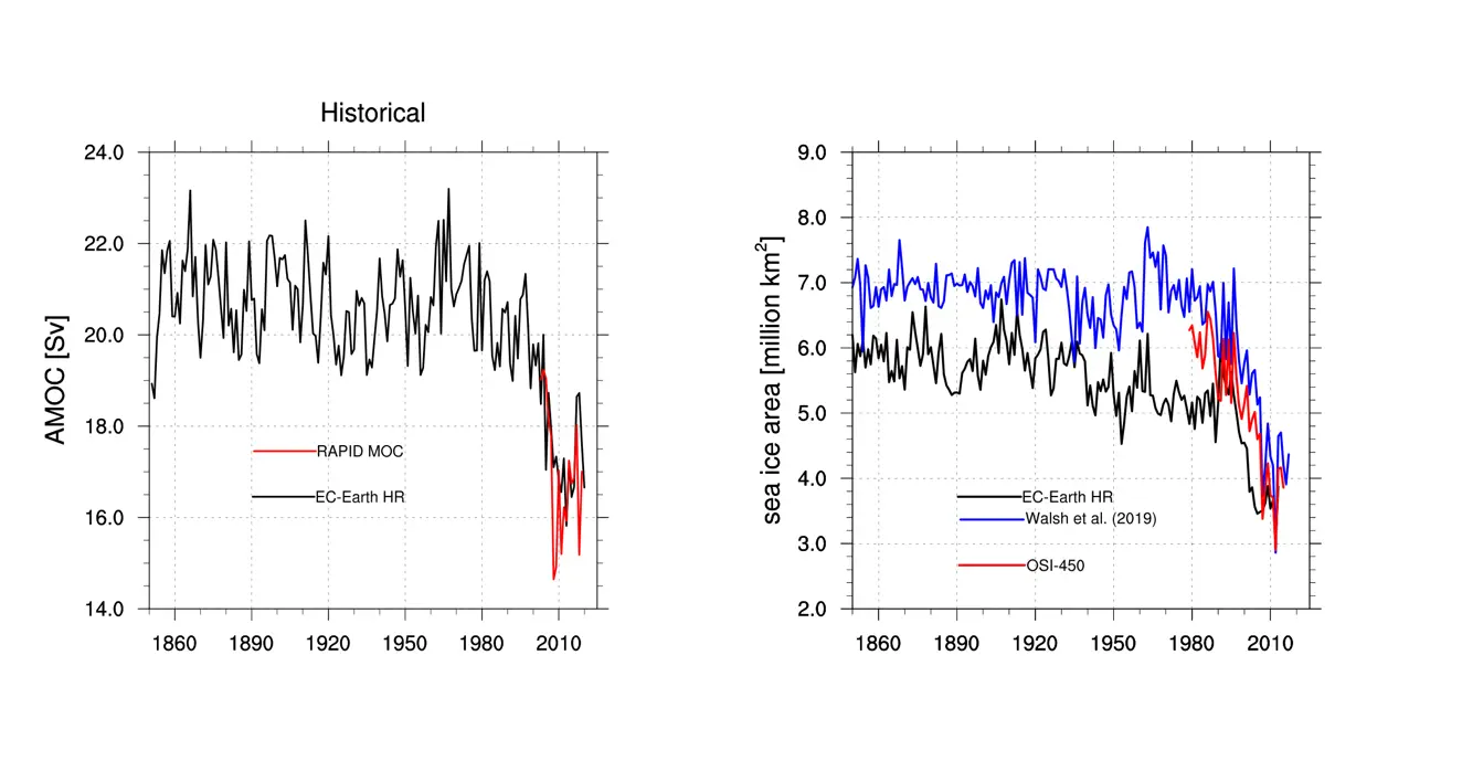 Zoom imageLeft: Annual mean of AMOC at 26°N in a historical simulation with the high-resolution version of the global model EC-Earth (black) and observations at 26°N (red, RAPID ocean observations). Right: Arctic ice area in September in the EC-Earth model (black), in a sea ice reconstruction (blue, Walsh et al. 2019) and in satellite data (red, OSI-SAF).