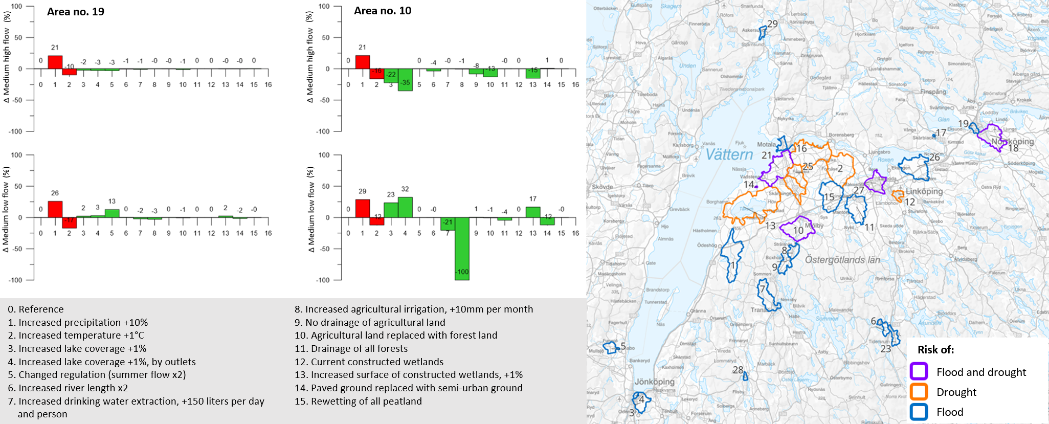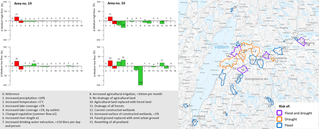 The figure shows impact calculations for two sub-basins in the Motala ström river basin. Changes in medium-high flow and medium-low flow are shown in percent, as a result of 15 different scenarios.