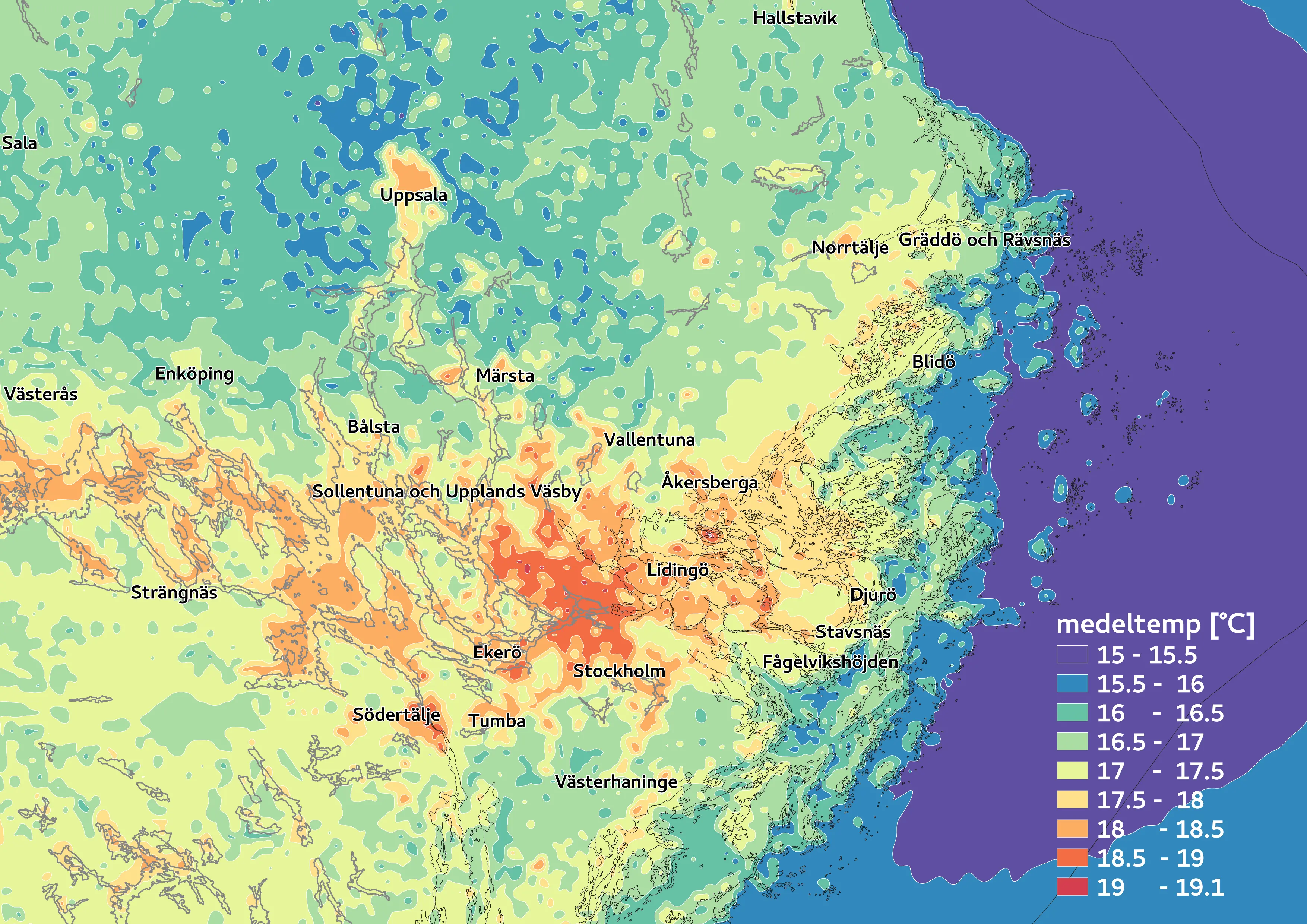 Zoom imageAverage air temperature, 2 metres above ground during summer 2014. The urban heat island effect in Stockholm results in temperatures that are up to 3°C higher than the surrounding countryside. The Baltic Sea has a cooling effect, while the warmer waters of lakes increase the average air temperature nearby.