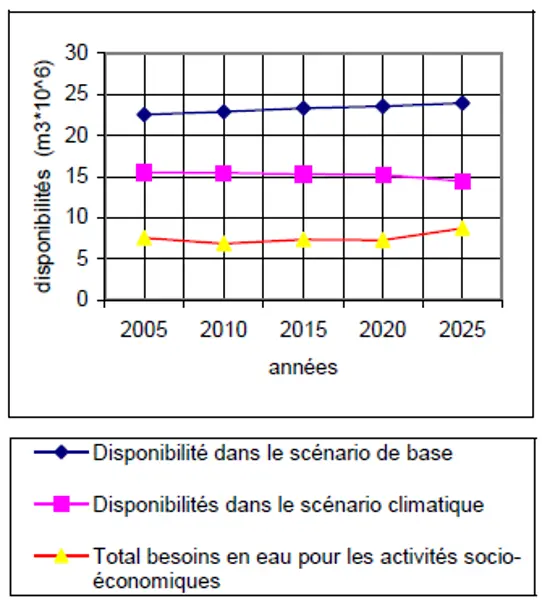 En termes de résultats, la comparaison des besoins en eau dans le bassin et des disponibilités dans le cas des deux scénarios climatiques se présentent comme suit: