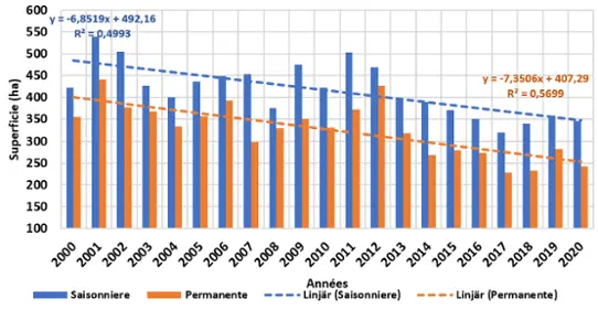 - Field visits to meet with the first farmers. The results of the analysis show a clear downward trend in the seasonal and permanent water surfaces of the Nakanbé-Mané basin wetland.