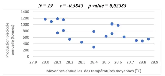 Figure 1: Kendall’s correlation between fishing production and annual average temperatures (Source: based on data provided by the National Meteorological Agency and Bagrépôle).