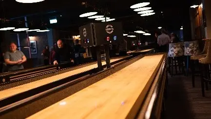 Shuffleboard is played by sliding weighted pucks down a long, smooth table towards a scoring area, aiming to land them in the highest point zones without falling off the end. Players take turns and can knock opponents' pucks out of position to gain an advantage. Photo: Hugo Stekhus-Klubb-Bowling.