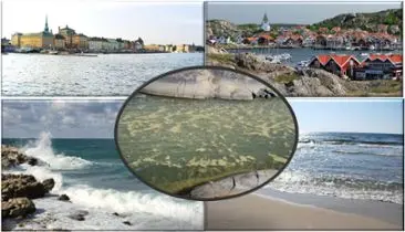 Olika skärgårds- och kustområden. Algblomning i Stockholms skärgård i juli 2008 (figuren i mitten).
