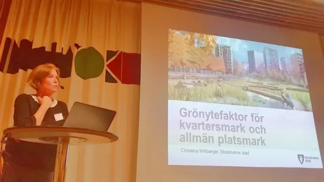 Christina Wikberger understryker hur viktigt det är med gröna ytor i stadsmiljöer. Grönytefaktor införs som ett krav vid ny bebyggelse i Stockholms stad.