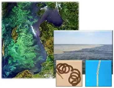 Den dominerande cyanobakterien i Östersjön är den giftiga Nodularia spumigena (vänster) och den ogiftiga Aphanizomenon sp. (höger).