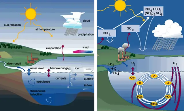 Förstora bildenÖversiktlig bild över processer som ingår Kustzonsmodellen. Bilden till vänster visar de fysiska processerna i PROBE och bilden till höger de biogeokemiska processerna i SCOBI.