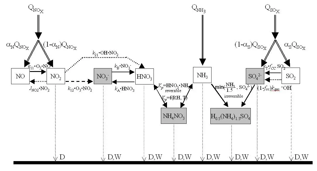 Förstora bildenEn del av ett förenklat kemi-schema som används i MATCH. Q är emissioner, D är torrdeposition och W är våtdeposition. Skuggade ämnen existerar som partiklar, de andra är gaser.