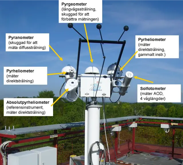 Förstora bildenEn av SMHIs avancerade strålningsstationer. Mätinstrumenten sitter på en solföljare, en robotplattform, som ser till att mätinstrumenten är riktade mot solen. Solföljare finns idag i Kiruna, Visby och Norrköping.