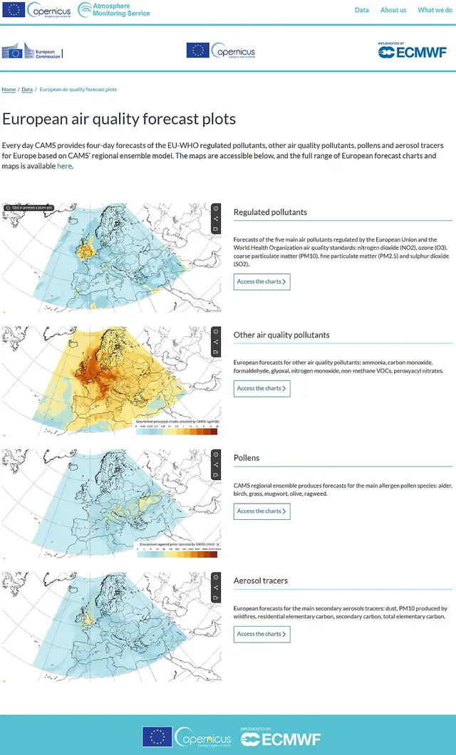 CAMS ger luftkvalitetsprognoser och analyser över Europa. Varje modell i CAMS levererar prognoser för koncentrationer av flera föroreningar, till exempel ozon, kvävemonoxid och kvävedioxid, svaveldioxid, partiklar och pollen från olika trädslag beroende på säsong.
