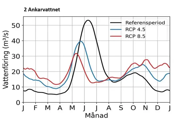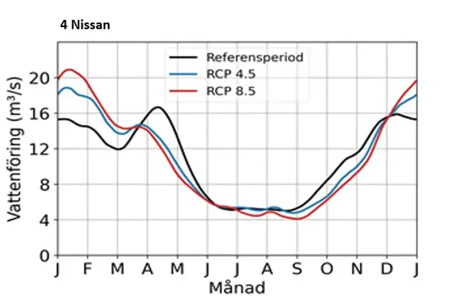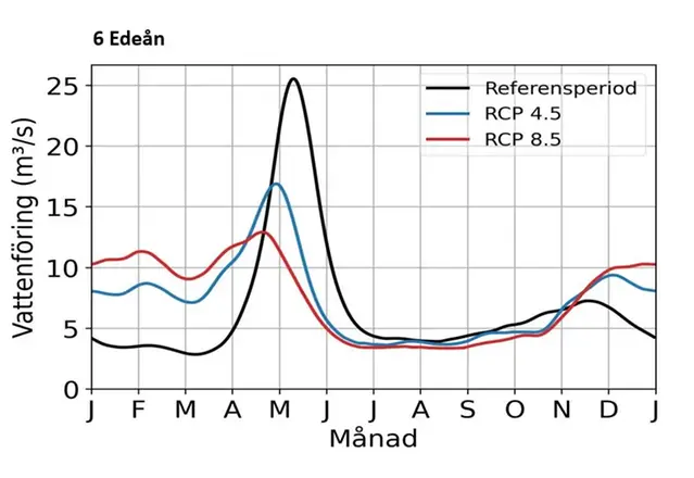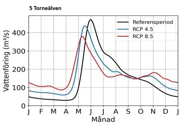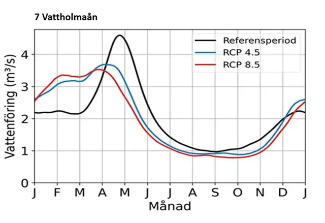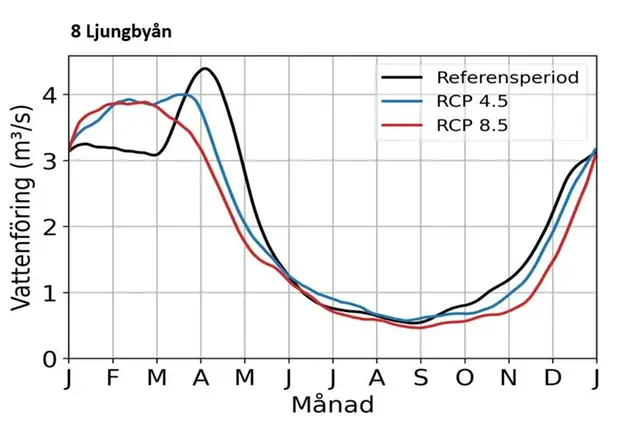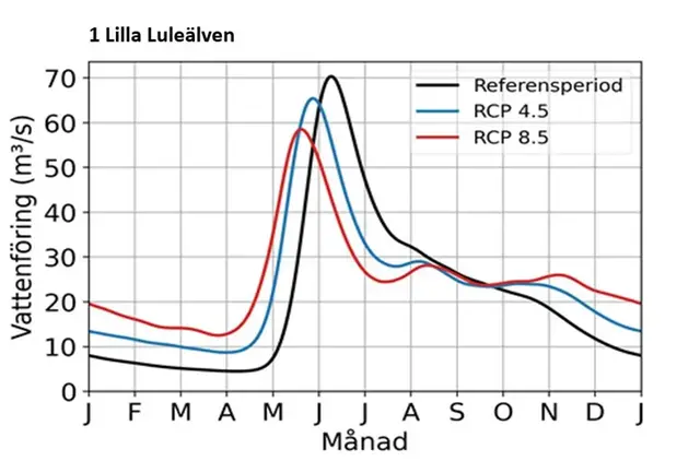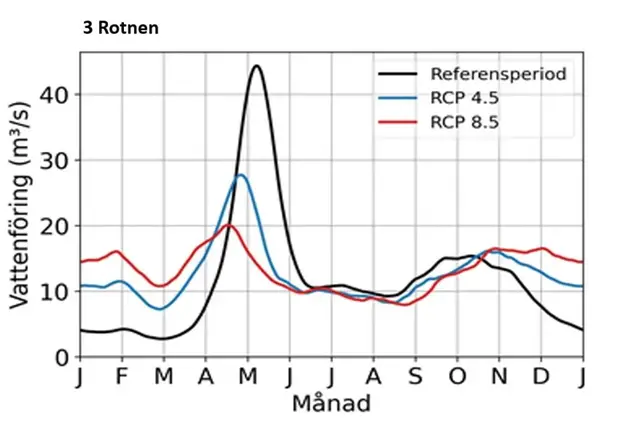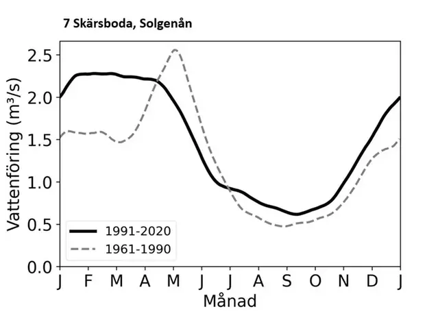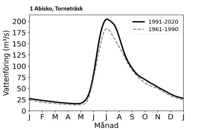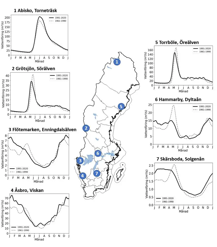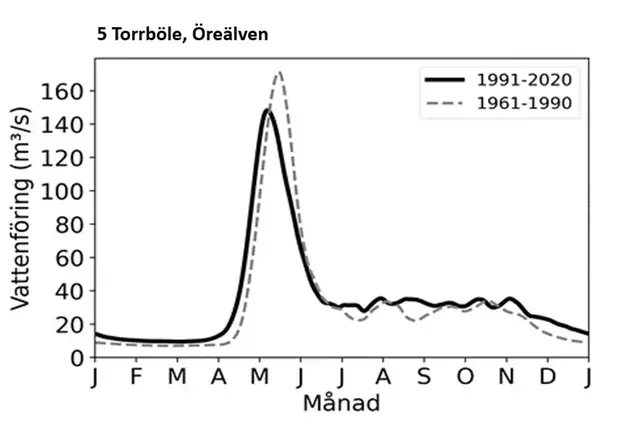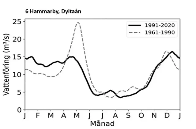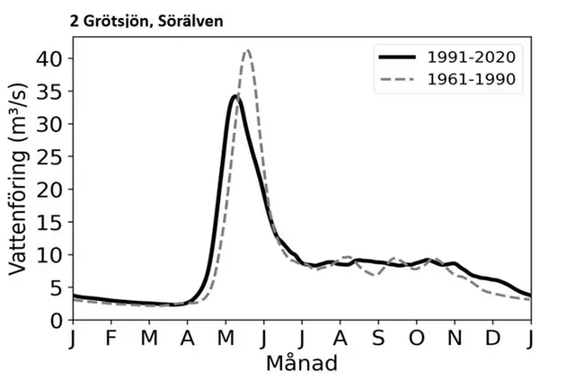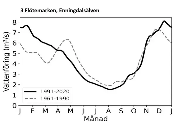 Vi ser redan att mönstret för vattenflödets variation under året har förskjutits på grund av att klimatet har förändrats. Den typ av årsvariation i vattenflöden som finns i södra Sverige blir vanligare allt längre norrut i landet. Speciellt tydligt är detta i delar av Svealand och södra Norrland där vintrarna inte är lika stabila som de var tidigare. Se figuren nedan.