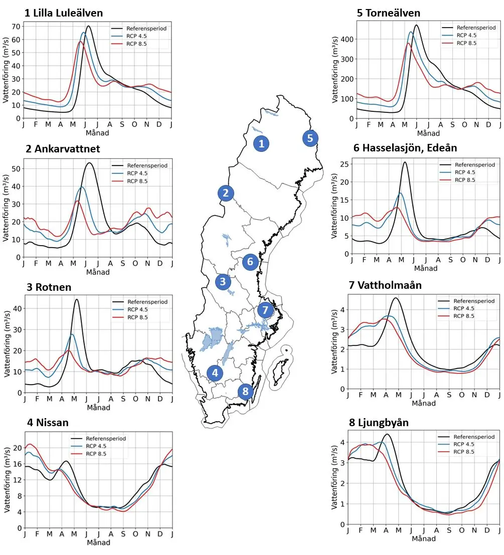 Förstora bildenVattenföringens årsdynamik för åtta oreglerade eller måttligt reglerade vattendrag i landet för referensperioden 1971–2000 (svart linje) samt för utsläppsscenarierna RCP4,5 och RCP8,5 2071-2100 (blå respektive röd linje).