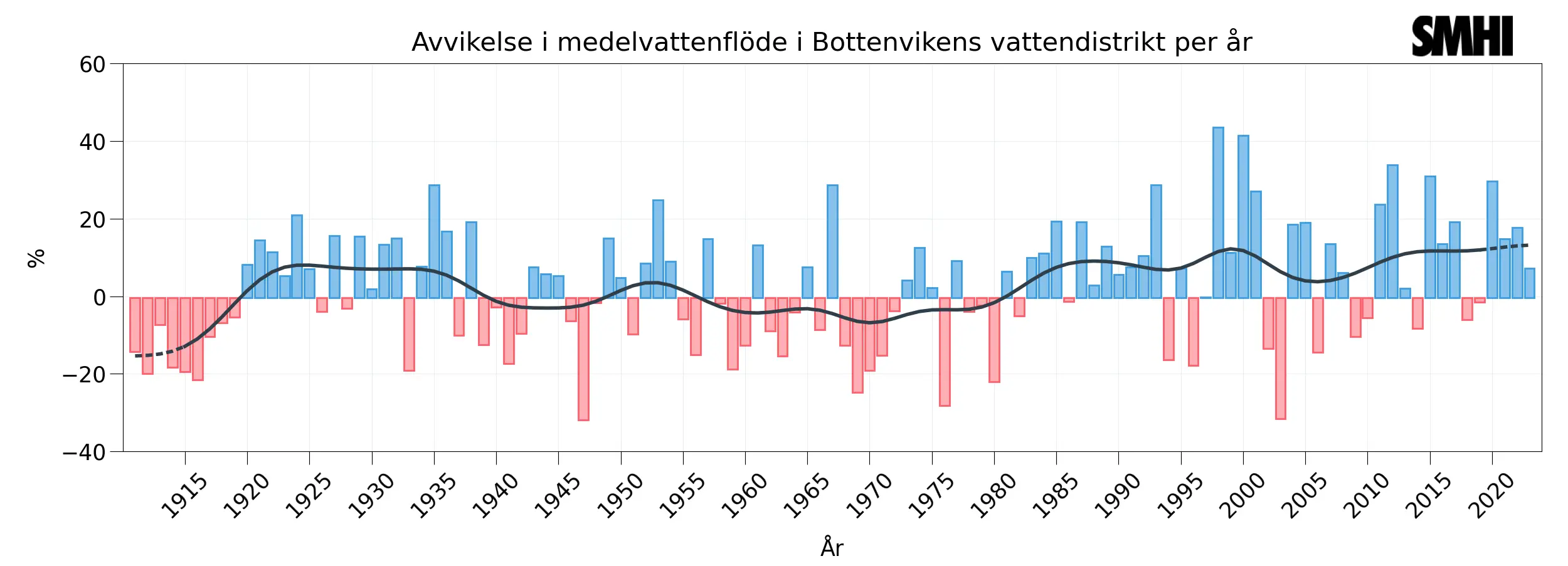 Förstora bildenStaplarna i diagrammet visar genomsnittlig avvikelse i medelvattenflöde för stationer i Bottenvikens vattendistrikt per år. Blå staplar visar högre och röda lägre värden än medelvärdet för normalperioden 1961–1990. Den grå linjen visar ett glidande medelvärde beräknat över ungefär tio år.