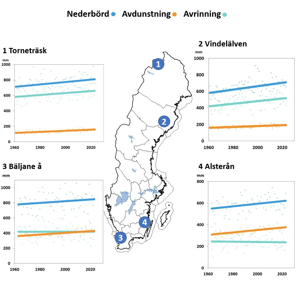 Förändringen kan ses i diagrammen nedan. Där visar trendlinjer årlig nederbörd, avdunstning och avrinning för avrinningsområdet till fyra av SMHIs vattenföringsstationer. Som syns i figurerna är variationen i vattenbalansens komponenter stor mellan olika år. För de flesta går det dock att urskilja trender.