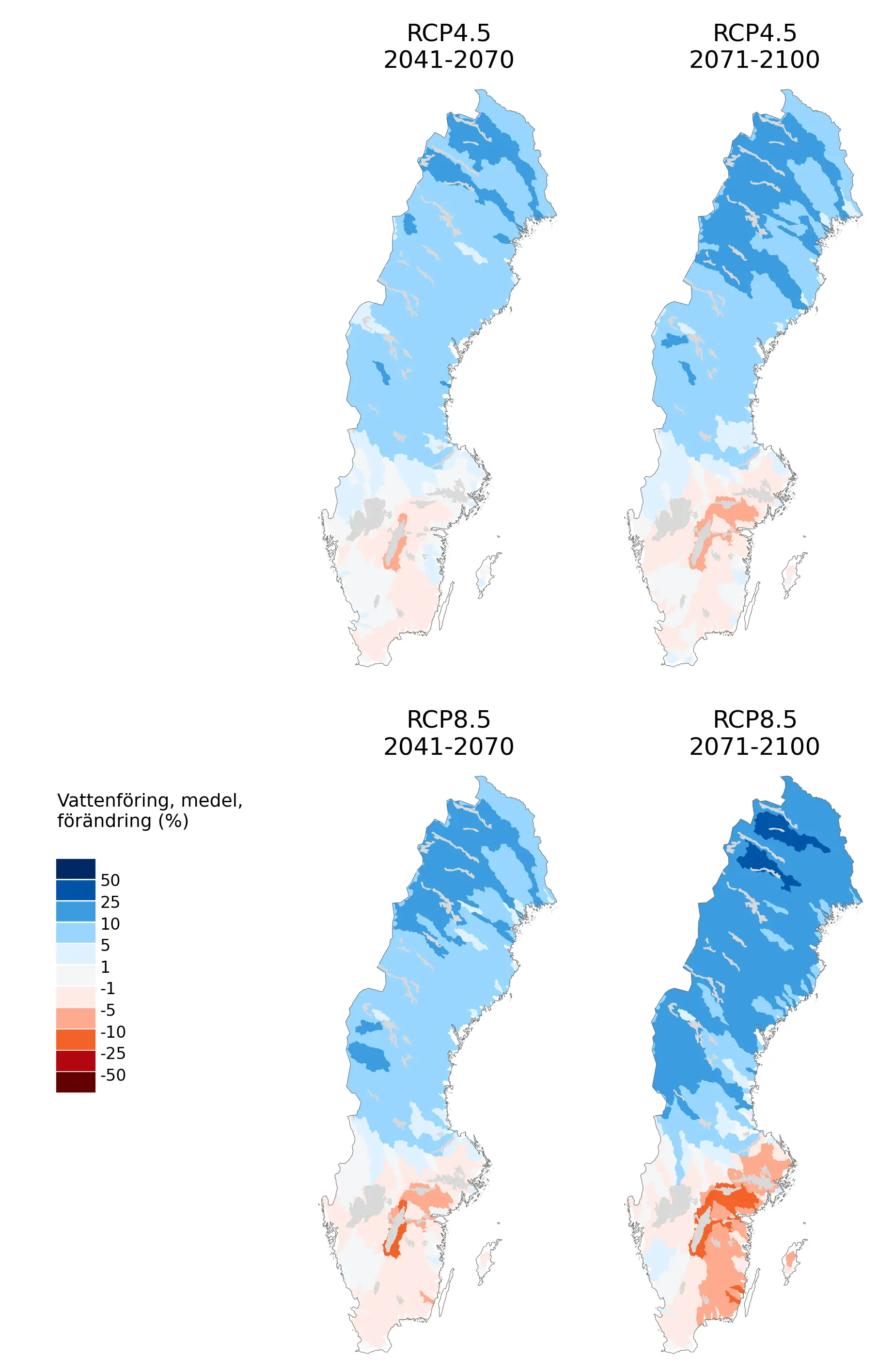 Förstora bildenFörändring i medelvattenföring för framtidsperioderna 2041–2070 och 2071–2100 jämfört med historiska tidsperioden 1971–2000. Framtidsperioderna beskrivs med utsläppsscenarierna RCP4,5 och RCP8,5. För kustområden med endast små vattendrag visas ingen förändring i kartorna. Stora sjöar är markerade i grått.