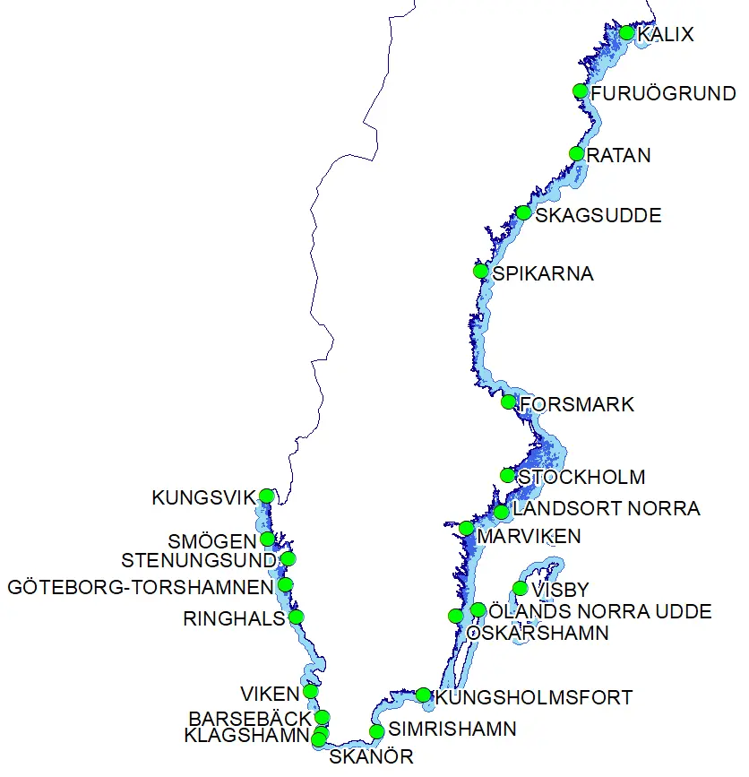 Kartan visar de vattenståndsstationer som använts för att beräkna medelnivån under referensperioden.