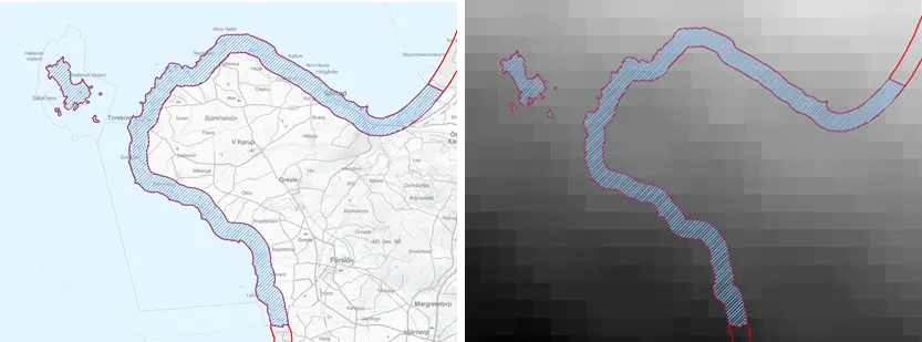 Båstad kommuns beräkningsområde visas som streckad markering innanför röda linjer i bilden till vänster. I den högra bilden syns det framräknade datasetet för det framtida medelvattenståndet där varje ruta i grått motsvarar ett värde. Siffrorna i tabellen för Båstad utgörs av medelvärdet för alla rutor som befinner sig inom kommunens beräkningsområde (området mellan de röda linjerna).