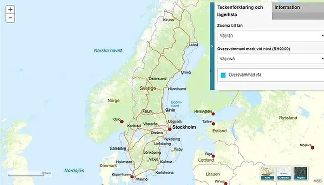 I MSB:s webbtjänst visas fasta vattenståndsnivåer på mellan 0,1 till 5 meter. Tjänsten ger en uppfattning om hur högt upp på land havet når vid specifika vattenståndsnivåer.