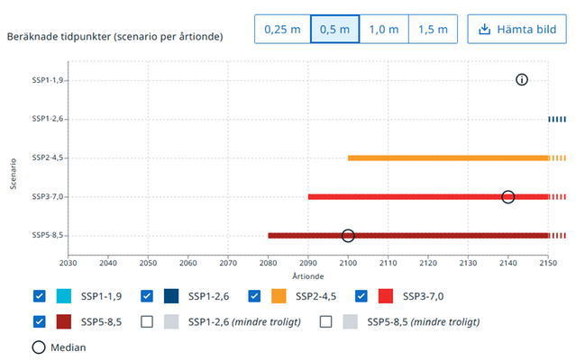 • SSP5-8,5: 0,5 meter i RH 2000 kan nås redan omkring år 2080 enligt den 83:e percentilen och omkring år 2100 enligt medianen för samma scenario. Sett till den 17:e percentilen kan det dröja till bortom 2150.