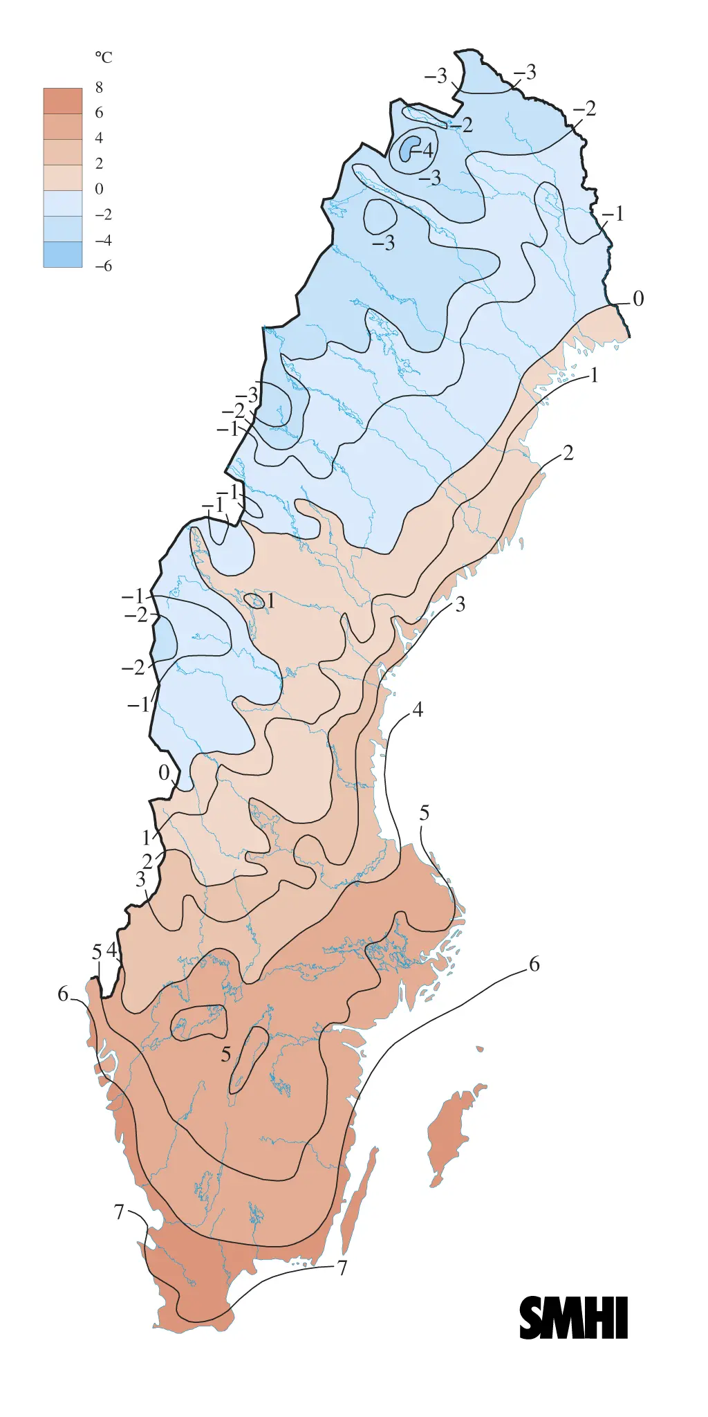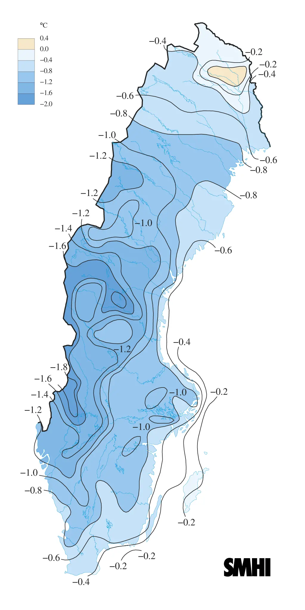 Parkalompolo i Norrbotten rapporterade en årsmedeltemperatur 0.2° över normalvärdet för perioden 1961-1990. Två andra stationer i nordostligaste Norrland hade normal årsmedeltemperatur.