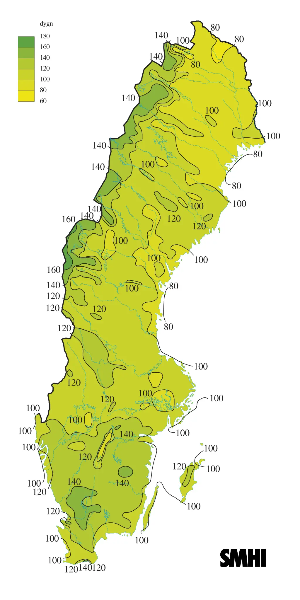I större delen av landet var antalet dygn nära det normala. Då ost- och nordostvindar dominerade under årets början och slut blev antalet dygn högre än normalt i nordöstra Götaland.