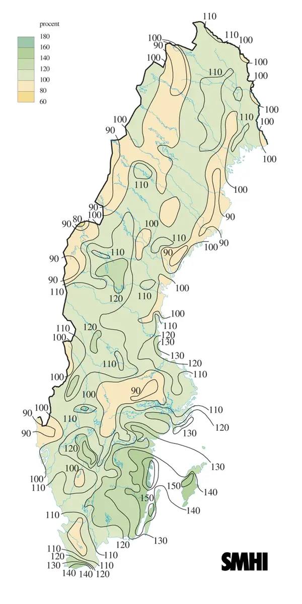 Förhållandevis torrast var det i västligaste Jämtland, där stationen Edevik endast fick 75% av normal årsnederbörd.